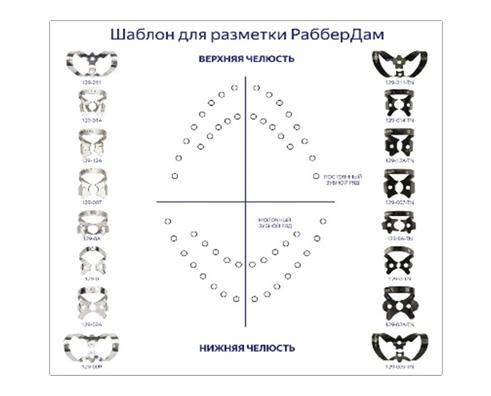 - Шаблон и пробойник – это инструменты, необходимые для точного позиционирования коффердама и создания отверстий в полотне, соразмерных с расположением конкретных зубов.